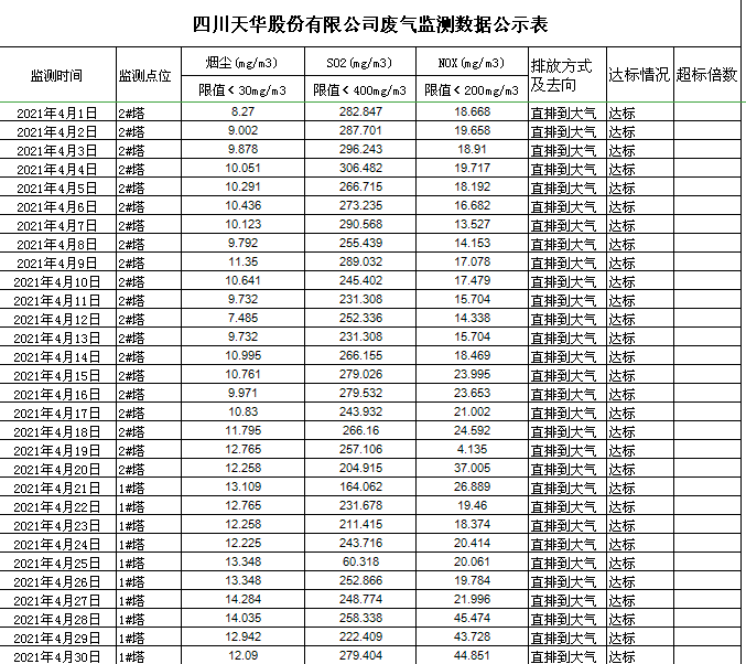 四川天華股份有限公司4月廢氣監(jiān)測數(shù)據(jù)公示