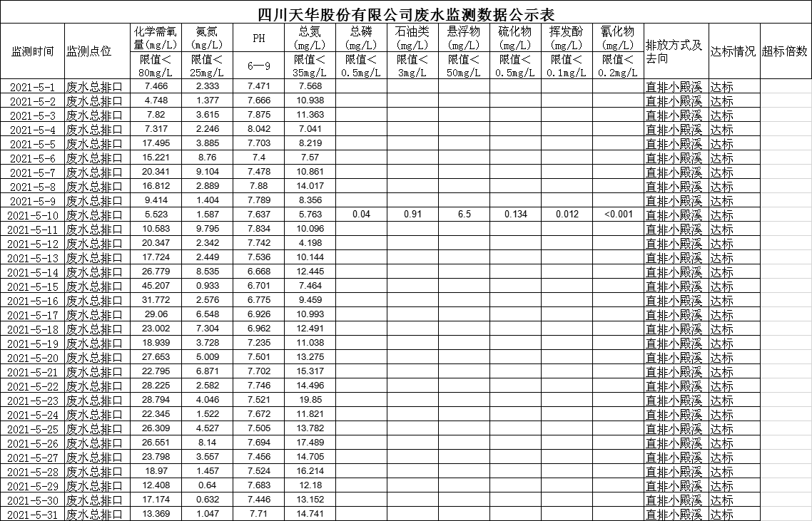 四川天華股份有限公司5月廢水監(jiān)測(cè)數(shù)據(jù)公示
