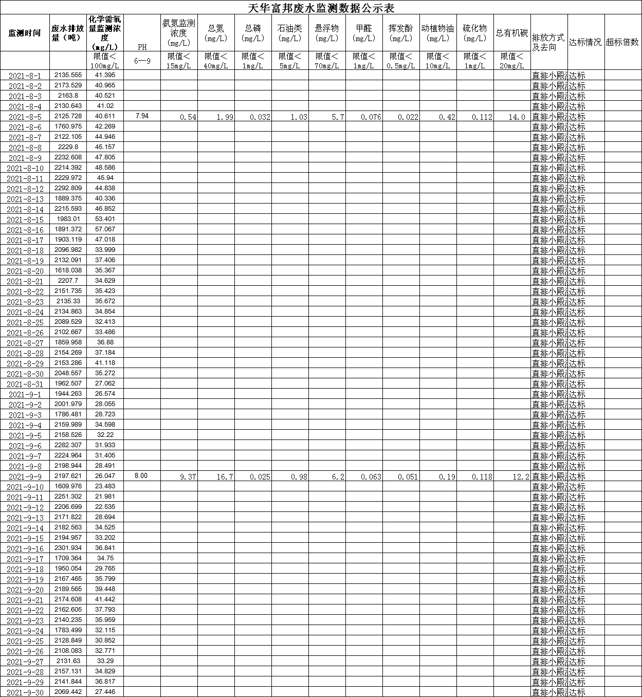 四川天華富邦化工有限責(zé)任公司8月、9月廢水監(jiān)測(cè)數(shù)據(jù)公示