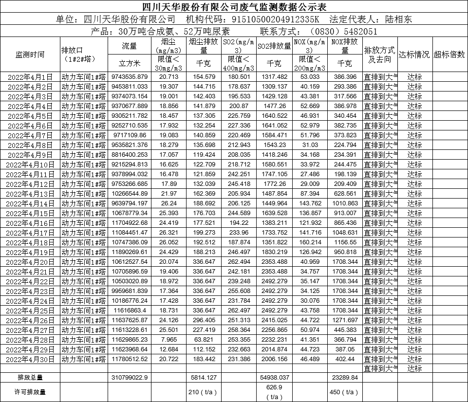 四川天華股份有限公司2022年4月份廢氣監(jiān)測(cè)數(shù)據(jù)公示